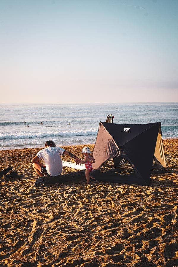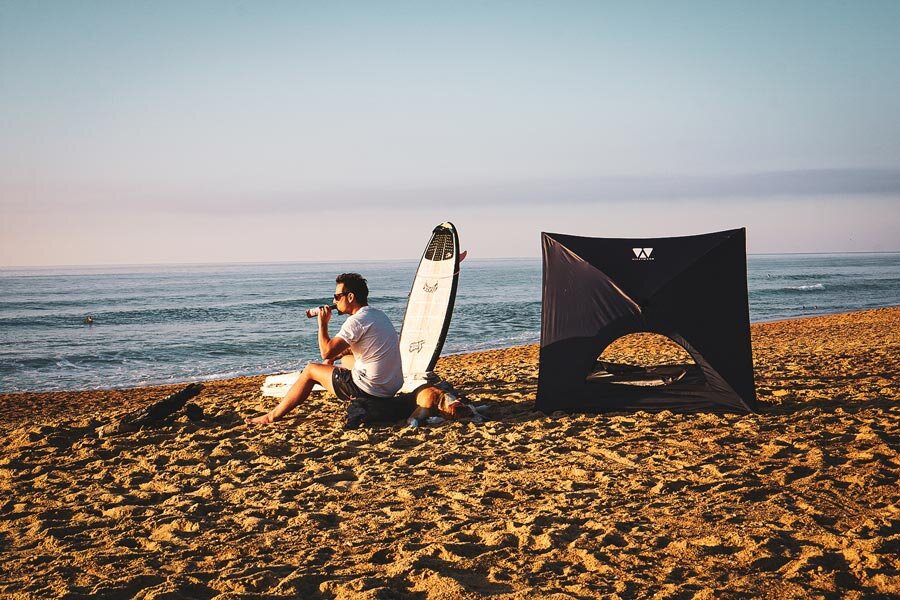 The lightweight and compact beach tent is super quick to set up and take down. By pulling or pushing the loops centered on the sides, the tent automatically erects or folds.