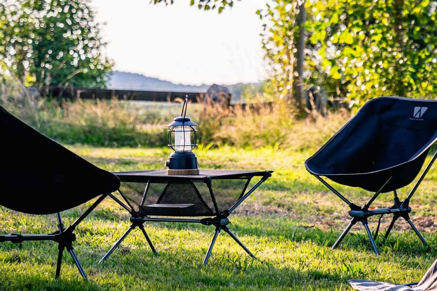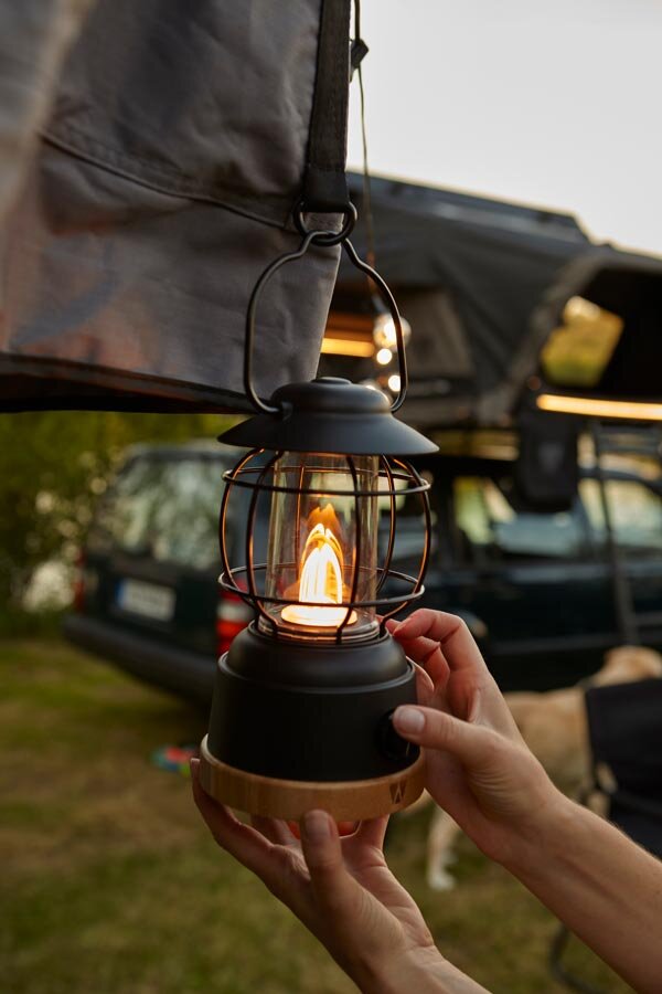 The VICKYWOOD WOODY LANTERN is a stylish, dimmable and rechargeable camping lamp with an integrated power bank. It combines warm ambient light with a high-quality design made of bamboo and stainless steel – perfect for camping, rooftop tents, van life or cozy evenings on the patio.